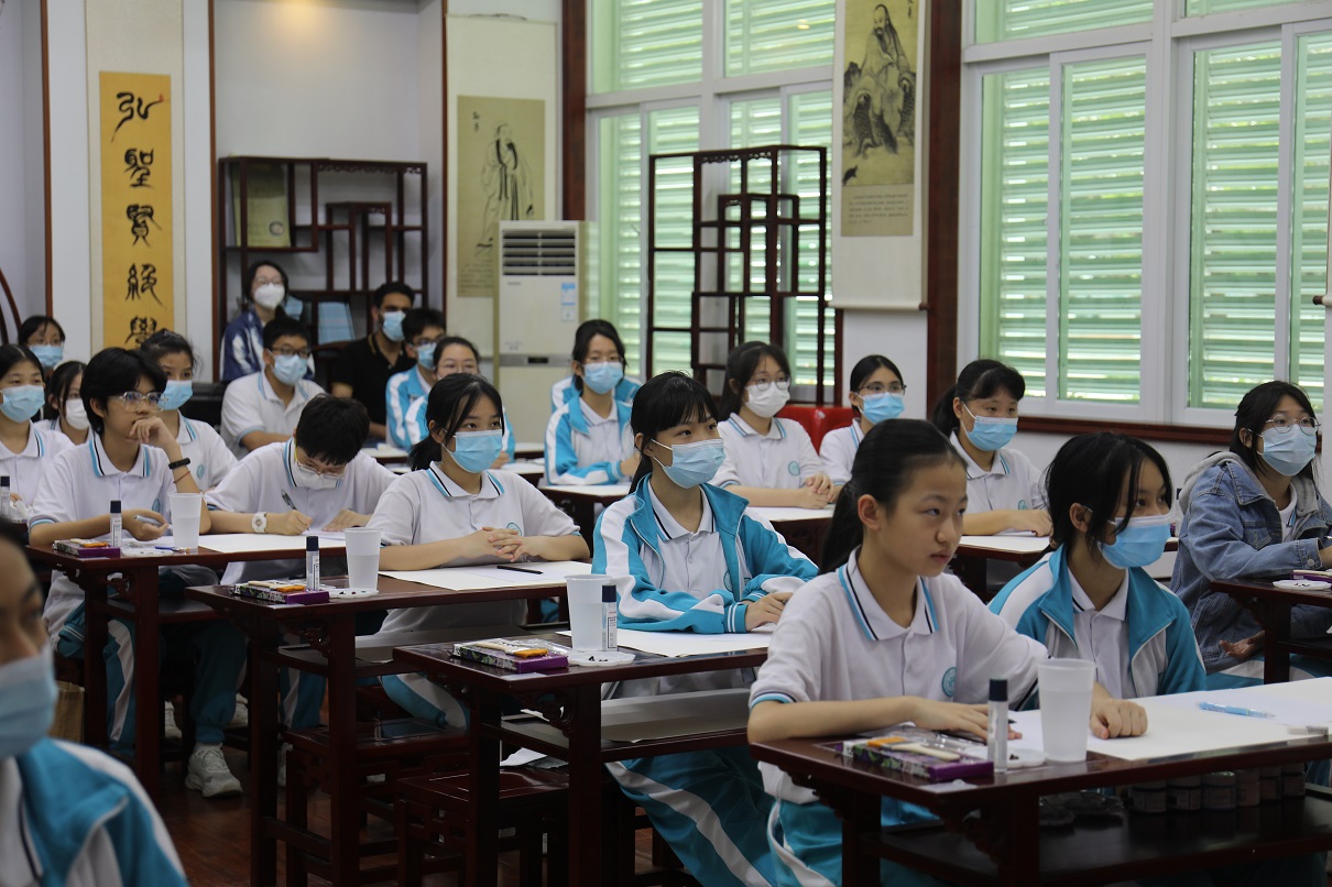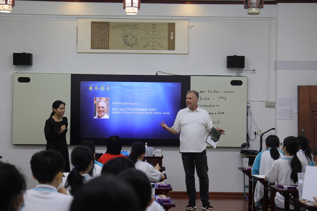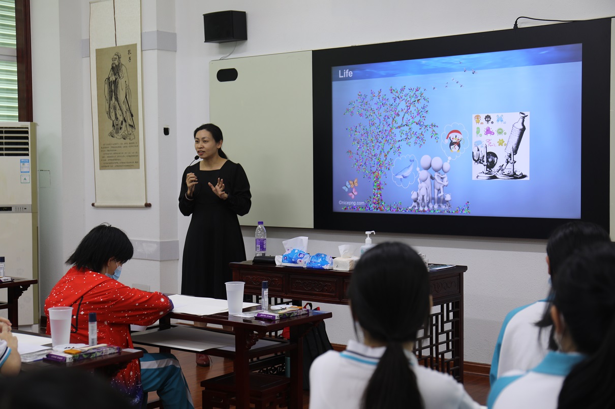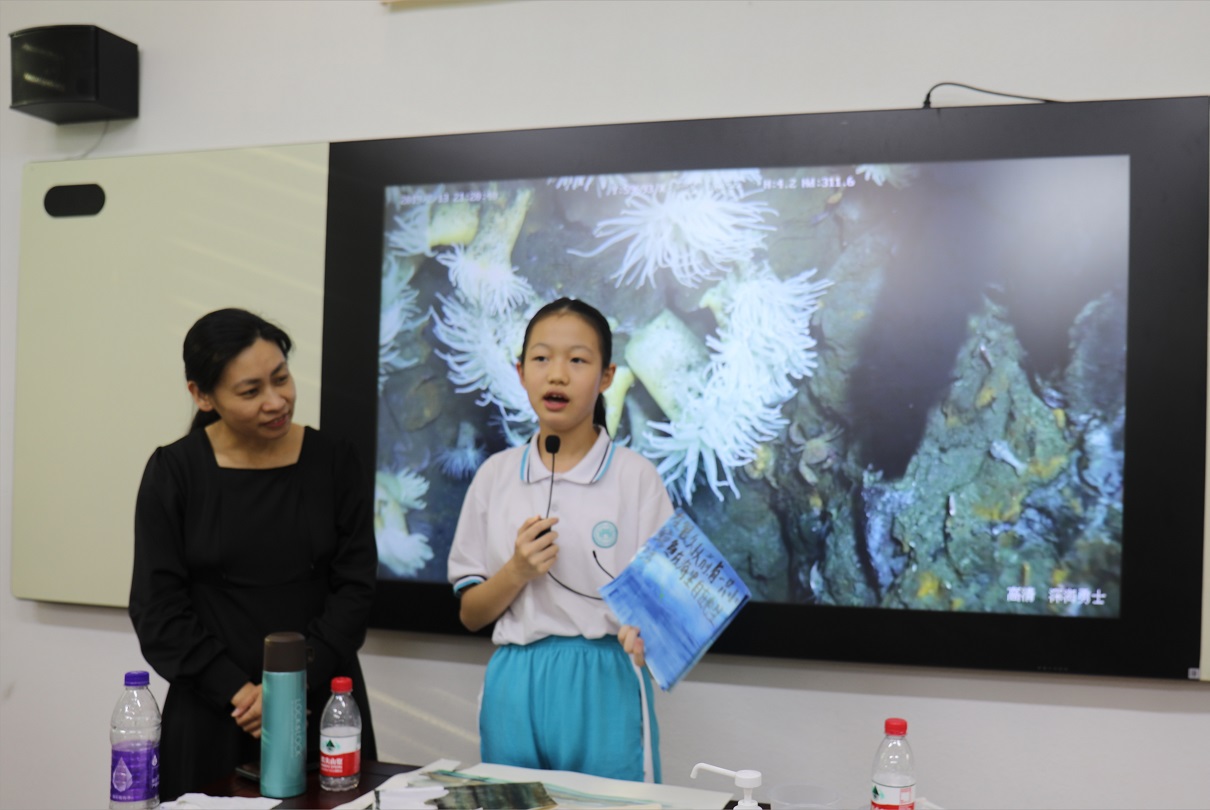 首先,來(lái)自深海所地外海洋系統(tǒng)研究室劉翠艷研究員為同學(xué)們開(kāi)展生動(dòng)的科普宣講,以幻燈片展示、現(xiàn)場(chǎng)交流互動(dòng)以及視頻介紹等方式通俗易懂地傳授生命的豐富形式、講述海洋故事,科普深海知識(shí),宣教“地外海洋”概念,提升海洋文化的親和力、感召力與影響力。同學(xué)們聽(tīng)得津津有味,受益匪淺。在隨后的藝術(shù)創(chuàng)作環(huán)節(jié),活動(dòng)特邀藝術(shù)家Angelo Segarra先生作為現(xiàn)場(chǎng)美術(shù)指導(dǎo),引導(dǎo)學(xué)生們繪制圖冊(cè)來(lái)編寫(xiě)一個(gè)科學(xué)性或科幻性的海洋故事。活動(dòng)中,學(xué)生們認(rèn)真作畫(huà),在水彩描繪的背景上勾畫(huà)出海洋中的珊瑚、水草、魚(yú)、蝦、蟹、水母、鯨魚(yú)等海洋生物,呈現(xiàn)他們腦海中的海洋故事。活動(dòng)最后,學(xué)生們現(xiàn)場(chǎng)分享自己的作品:初一的陳雅昀同學(xué)生動(dòng)形象地繪制了海洋中危險(xiǎn)環(huán)境,提醒大家要敬畏海洋,不要到危險(xiǎn)未知區(qū)域玩耍;李雅倩同學(xué)則描繪了一只誤吞塑料袋的小鯨魚(yú)痛苦地向人類呼救,呼吁大家保護(hù)海洋環(huán)境,重視海洋污染;簡(jiǎn)玉萱同學(xué)則用擬人的手法編寫(xiě)了一個(gè)小螃蟹和小鰻魚(yú)斗智斗勇的故事。活動(dòng)結(jié)束后,同學(xué)們紛紛表示對(duì)深海科學(xué)、海洋生態(tài)保護(hù)以及地外海洋的探索產(chǎn)生了濃厚的興趣。