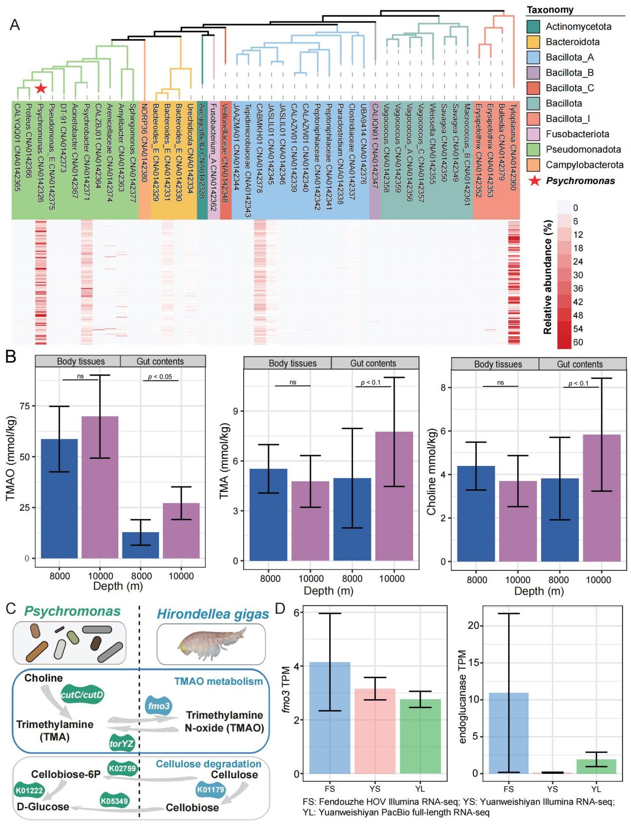 氧化三甲胺(TMAO)是一種滲透調節物質,在滲透壓調節以及在高靜水壓條件下維持細胞完整性方面發揮著重要作用。檢測發現,隨著深度增加,鉤蝦腸道內容物中TMAO濃度顯著升高,體組織中也呈現類似趨勢。鉤蝦自身編碼fmo3基因,可將三甲胺(TMA)轉化為TMAO。而其優勢共生菌Psychomonas的基因組中攜帶cutC和cutD基因簇,可將膽堿分解為TMA;同時擁有torYZ操縱子,可以將TMAO還原為TMA,從而調控宿主體內的TMAO濃度,形成動態平衡。
