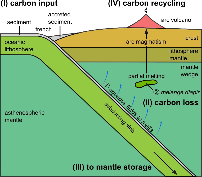 圖1. 以深部碳循環(huán)為視角的俯沖帶示意圖。碳通過多種途徑參與深部循環(huán):(I)沉積巖和大洋巖石圈(即地殼和巖石圈地幔)巖石向俯沖帶輸入碳。(II)在俯沖過程中,碳通過脫揮發(fā)分作用、溶解及部分熔融等方式從俯沖板塊中釋放。(III)部分碳被進(jìn)一步帶入地幔深處并儲(chǔ)存;(IV)一部分碳通過弧火山作用重新返回地表。需要注意的是,俯沖板片中碳的釋放可以用兩種端元模式來解釋。①傳統(tǒng)模式:認(rèn)為俯沖板塊釋放的流體和熔體導(dǎo)致地幔楔發(fā)生部分熔融,從而產(chǎn)生弧巖漿;②混雜巖(mélange)模式:認(rèn)為俯沖板塊的沉積物、蝕變洋殼和水化的地幔物理混合形成的混合巖,以底辟(diapirs)的形式上升到地幔楔,熔化后產(chǎn)生弧巖漿。
