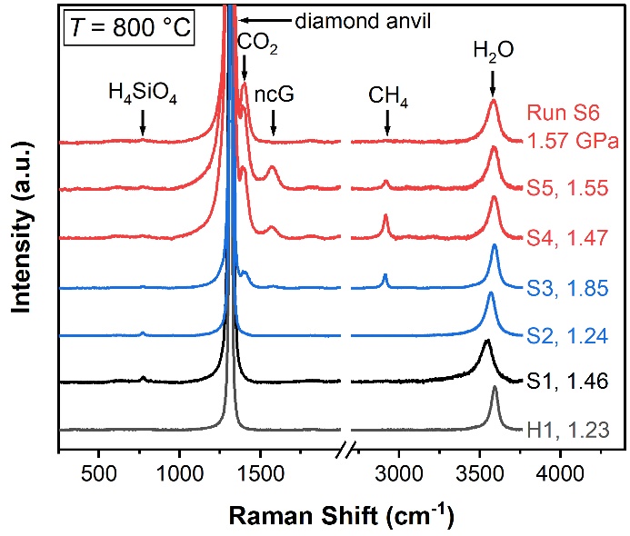 圖2. 比較純H2O(H1實(shí)驗(yàn))、SiO2-H2O(S1實(shí)驗(yàn))和SiO2-COH(S2-6實(shí)驗(yàn))體系在800 ℃和約1.5 GPa下超過一小時(shí)的含水流體拉曼光譜。請(qǐng)注意,光譜的基線已校正,強(qiáng)度已根據(jù)近3600 cm-1處的H2O峰高進(jìn)行了歸一化處理。