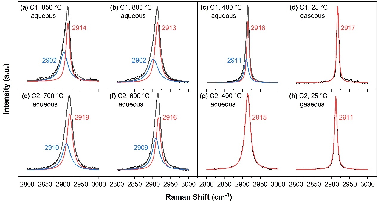 圖 3 2800-3000?cm-1波長(zhǎng)區(qū)域內(nèi)從高溫到低溫還原的含CH4的含水流體和氣相的拉曼光譜擬合結(jié)果。在C1實(shí)驗(yàn)中,鋯石被用作壓標(biāo)。800和850 ℃的拉曼光譜是在加熱過程中收集的,而400和25 ℃的光譜則是在達(dá)到最高溫度后冷卻過程中獲得的。在C2實(shí)驗(yàn)中,沒有使用壓標(biāo),以消除潛在的硅酸鹽干擾。600和700 ℃的拉曼光譜是在加熱過程中采集的,而400和25 ℃的拉曼光譜是在達(dá)到最高溫度后冷卻過程中采集的。請(qǐng)注意,紅色曲線表示擬合的CH4主峰,藍(lán)色曲線表示擬合的肩峰。